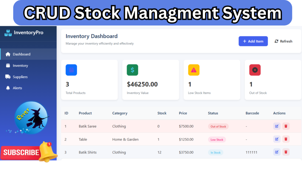 Dashboard Overview β Track total products, inventory value, low stock, and out-of-stock items.
